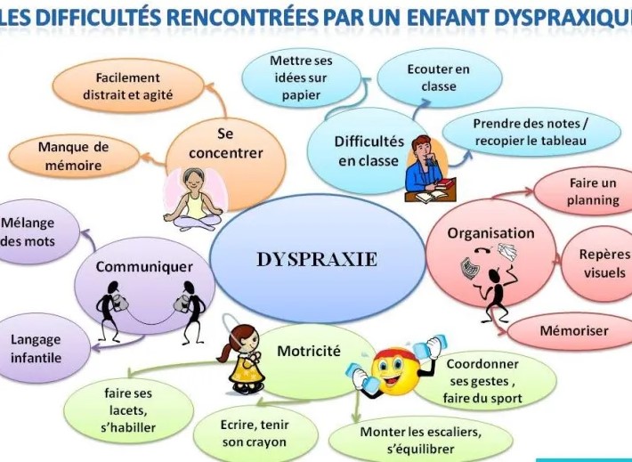 La dyspraxie est le syndrome de » l’enfant maladroit ». C’est un handicap souvent discret qui atteint entre 5 et 7 % des enfants. Il s’agit d’un dysfonctionnement de la planification des gestes volontaires et de la motricité fine. Ces gestes , normalement automatisés après un apprentissage (tenir sa cuillère, nouer ses lacets, écrire….) ne le sont pas chez les dyspraxiques.